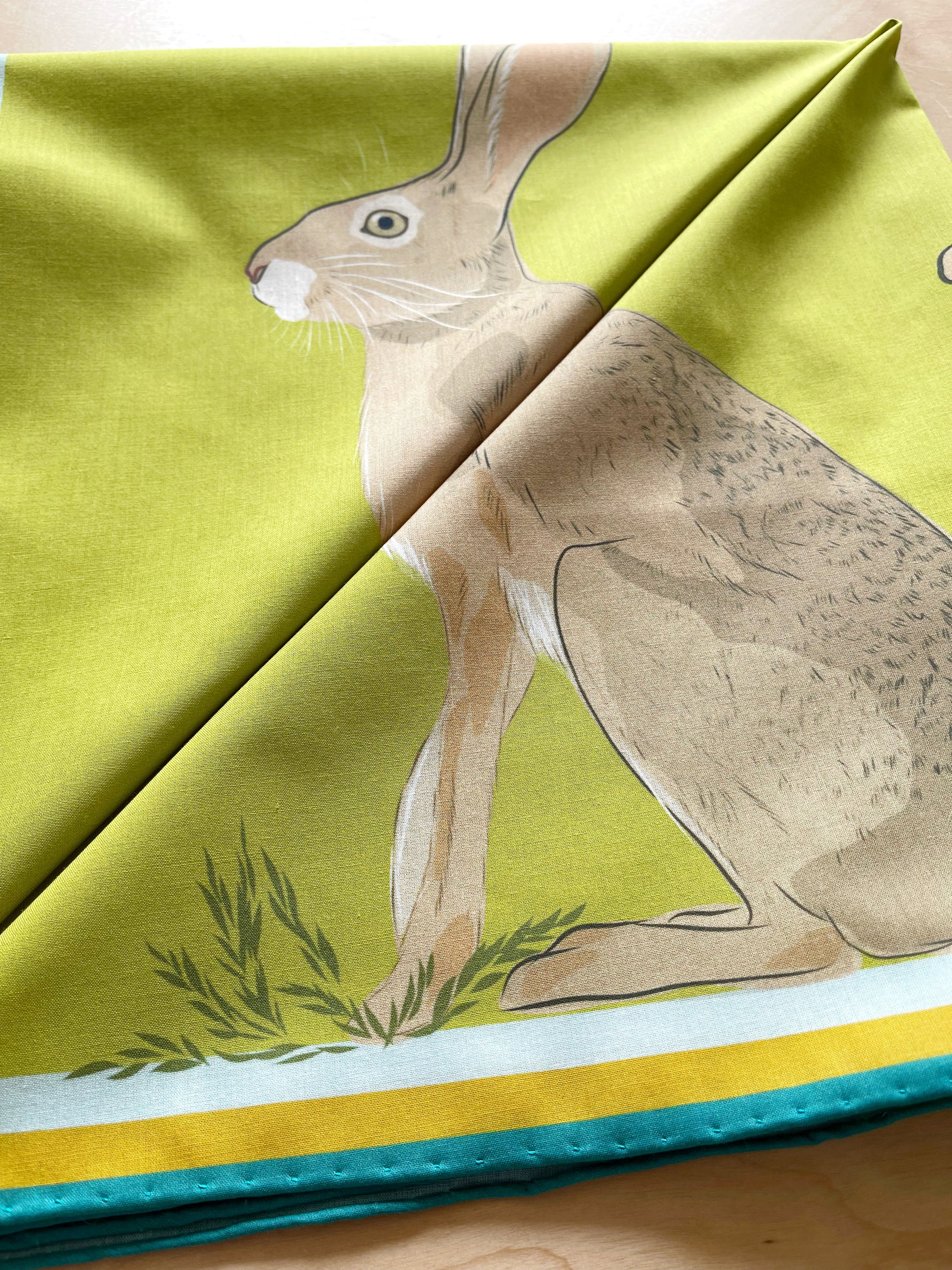 Here’s my Jackrabbit drawing with a Peridot green background. My hare is all soft browns & peachy pinks set against a verdant ground with pale blue, dandelion yellow & turquoise blue in the border.Done in a soft Pima Cotton Lawn with options for 1/8” fine machine or hand stitched rolled hems(rolled hems pictured), approximately 26” square. Fabric printed in the UK, drawings and stitching done by myself.