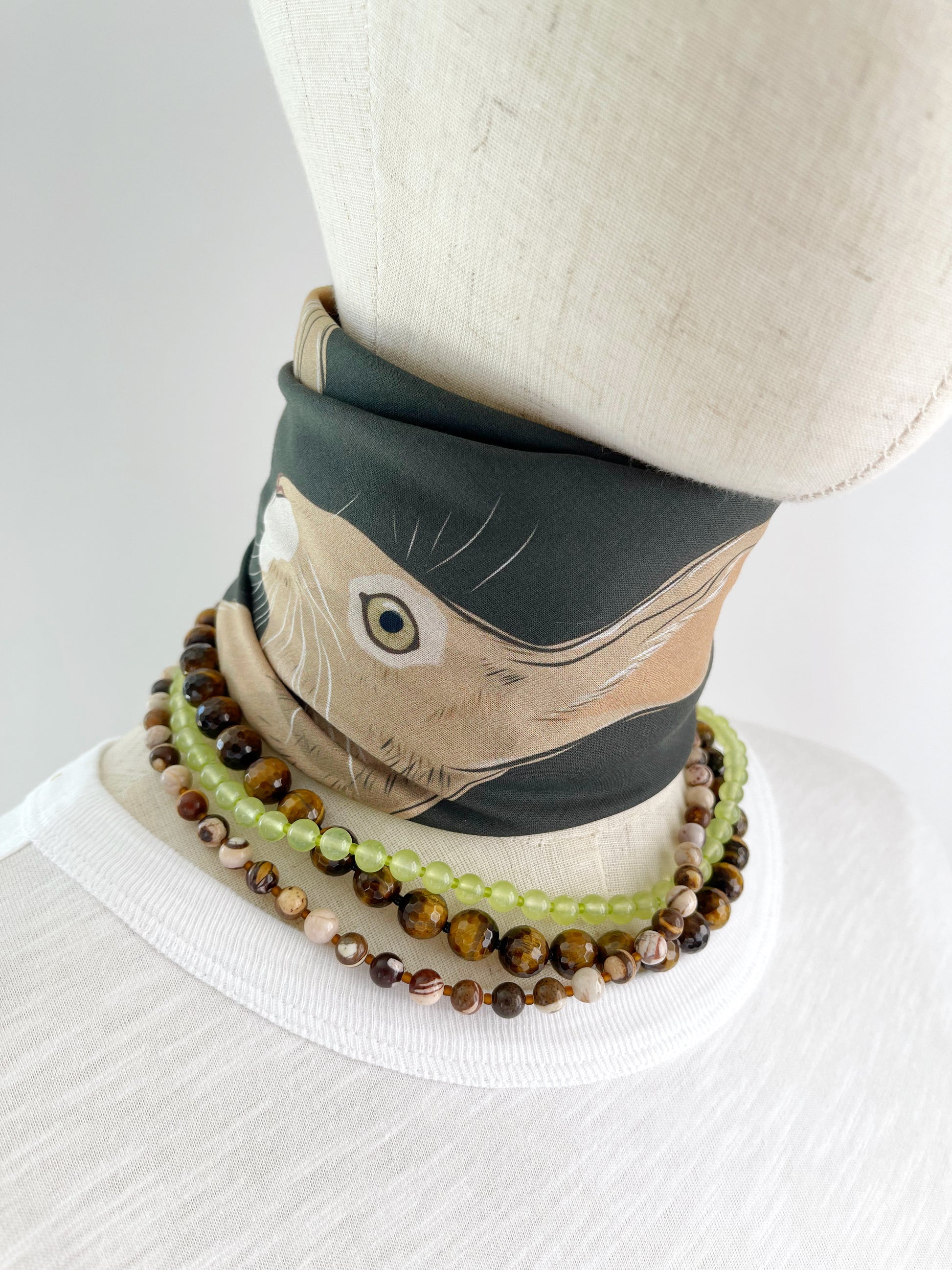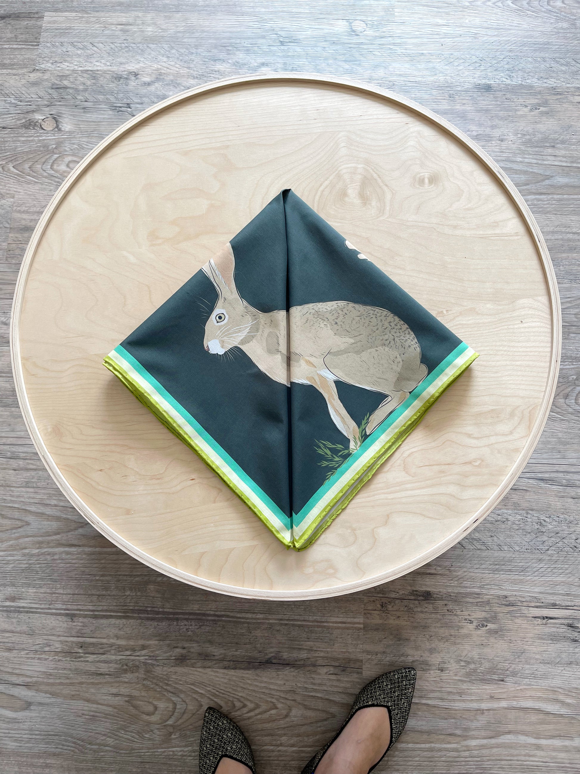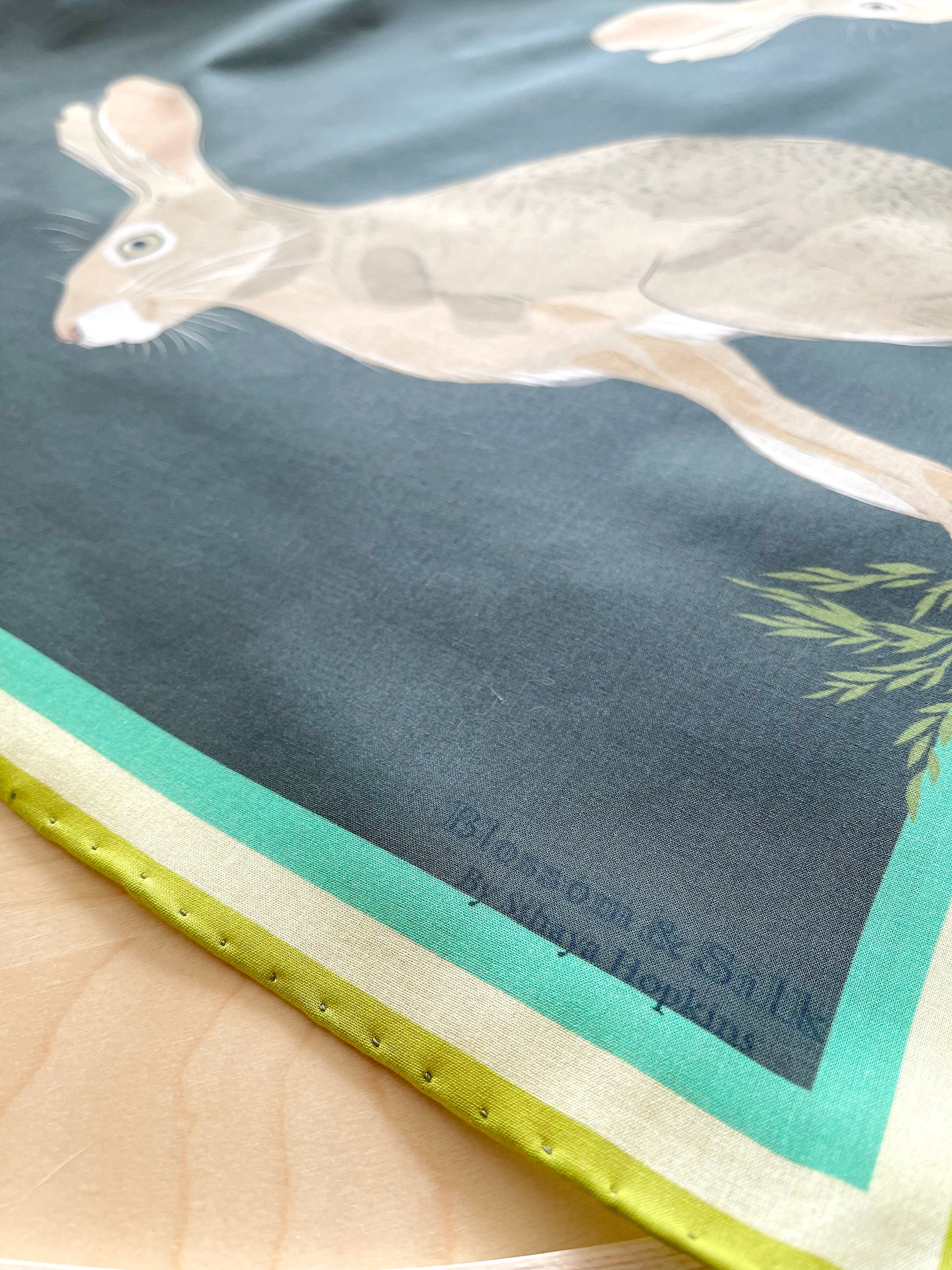 Here’s my Jackrabbit drawing with a dark chocolate brown background. My hare is all soft browns & peachy pinks set against this earthy ground with teal, straw & aloe green in the border.Done in a soft Pima Cotton Lawn with options for 1/8” fine machine or hand stitched rolled hems(rolled hems pictured), approximately 26” square Fabric printed in the UK, drawings and stitching done by myself.