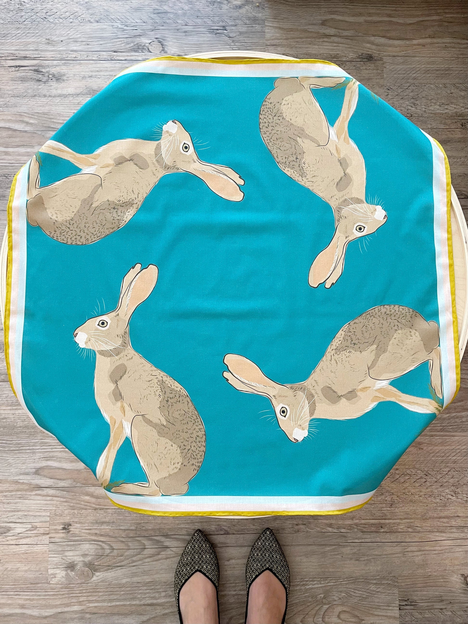 Here’s my Jackrabbit drawing with a deep turquoise blue background. My hare is all soft browns & peachy pinks set against a bold ground with pale blue, pink & yellow ocher in the border.Done in a soft Pima Cotton Lawn with options for 1/8” fine machine or hand stitched rolled hems(rolled hems pictured), approximately 26” square. Fabric printed in the UK, drawings and stitching done by myself.