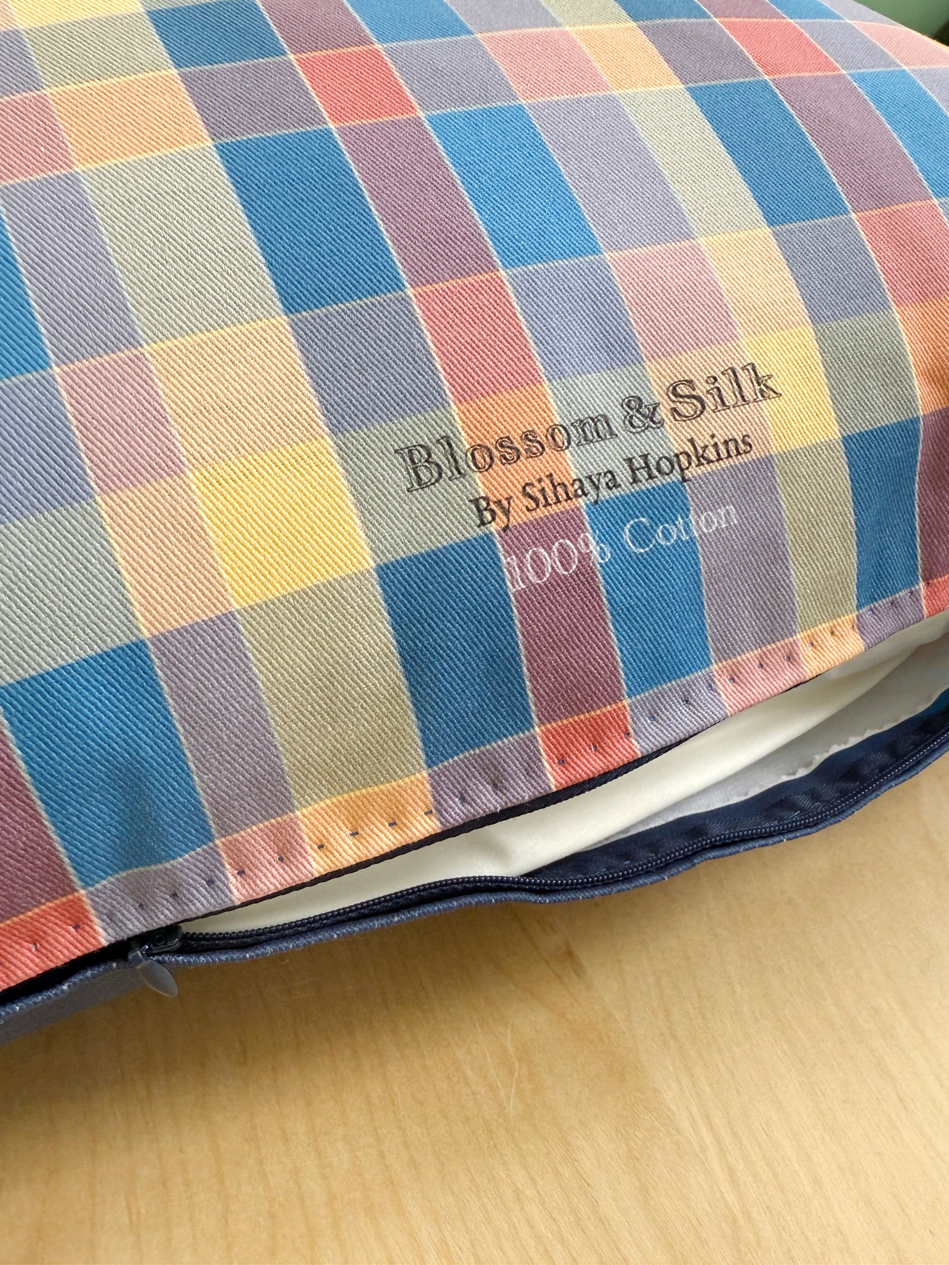 My Bold Sky design printed on Organic Cotton Drill as a 20” throw pillow. This drawing depicts the amazing bold colors we often get in our southwest sunsets. This has a plaid back with all the colors of the drawing, a hidden zipper along the bottom and a 20” feather pillow insert with a cotton case.