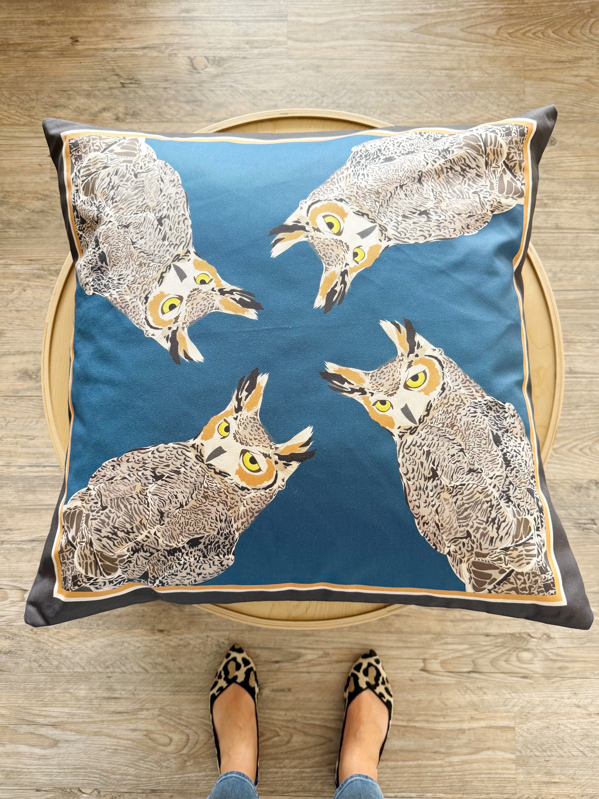 My Great Horned Owls design printed on 100% Cotton Denim as a 26” throw pillow. It has an overlap back and a 26” feather pillow insert with a cotton case. Also available without the insert.