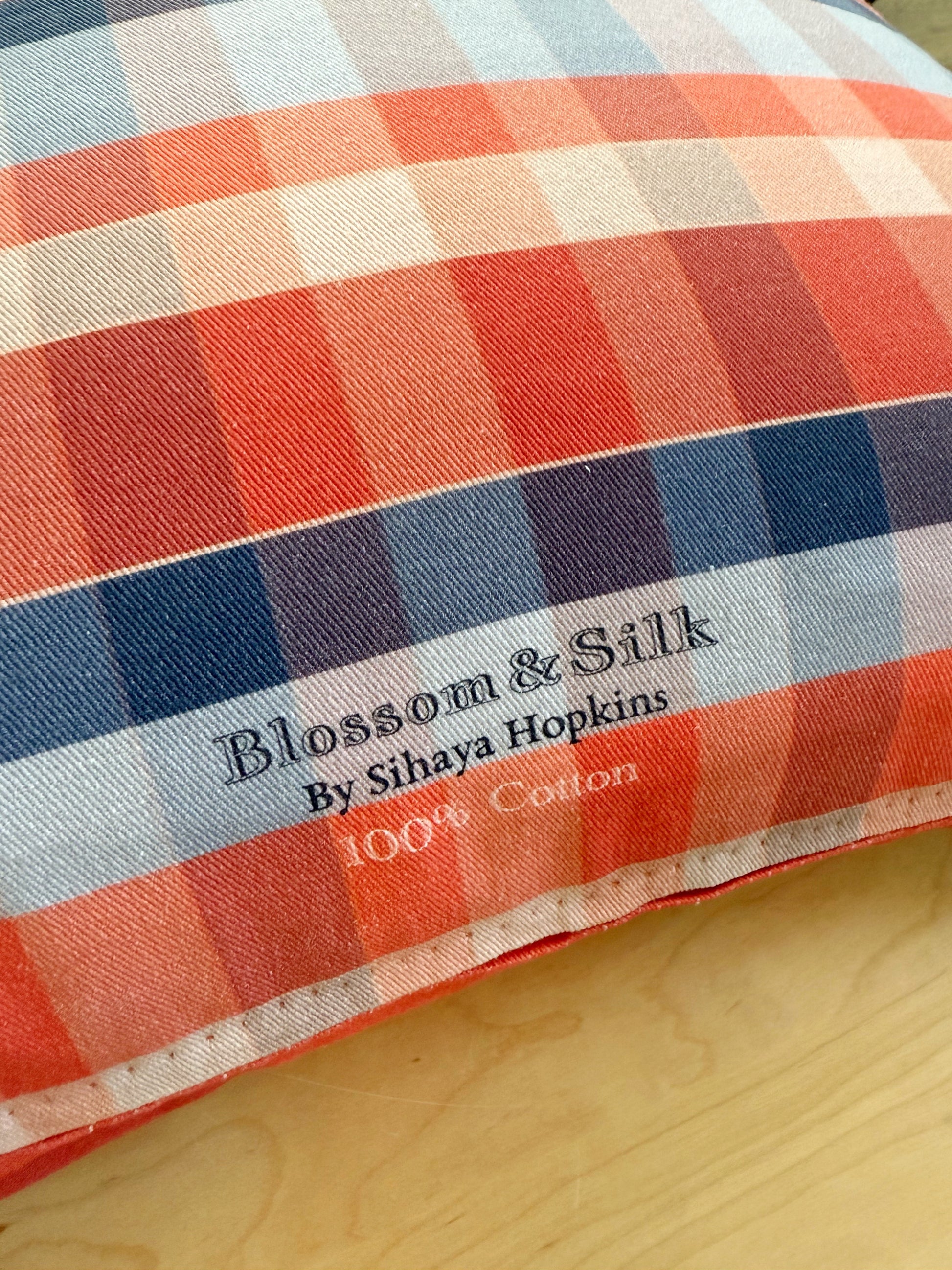 My Jackrabbits design printed on Organic Cotton Drill as a 20” throw pillow. The colors in this range from gray and gray/blue with apricot in the rabbits ears, on an orange background. This has a plaid back with all the colors of the drawing, a hidden zipper along the bottom and a 20” feather pillow insert with a cotton case.