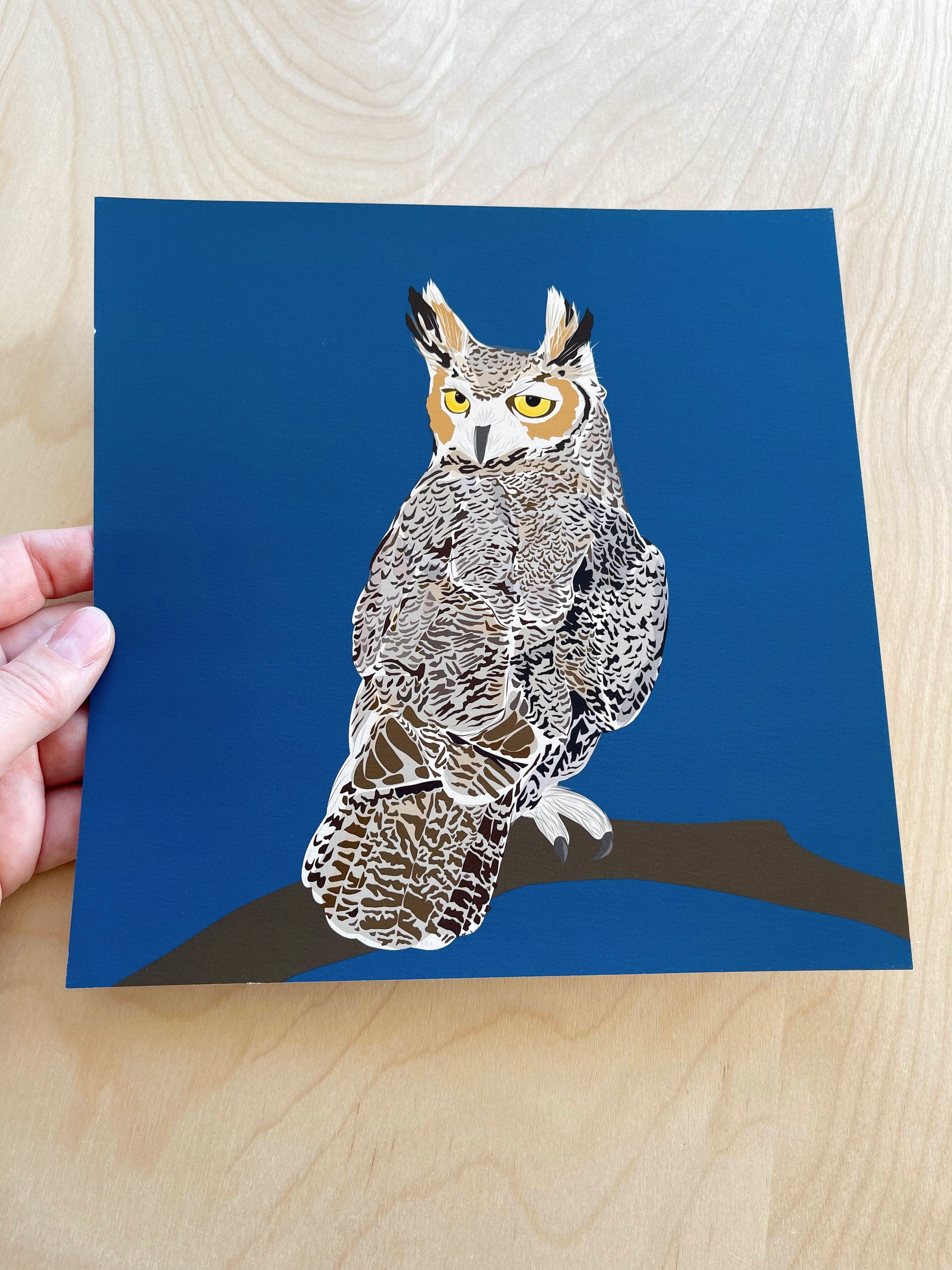 Here’s my drawing of a Great Horned Owl. Giclee printed on fine art photographic paper with a matte finish and slight watercolor paper texture, 8” x 8”.