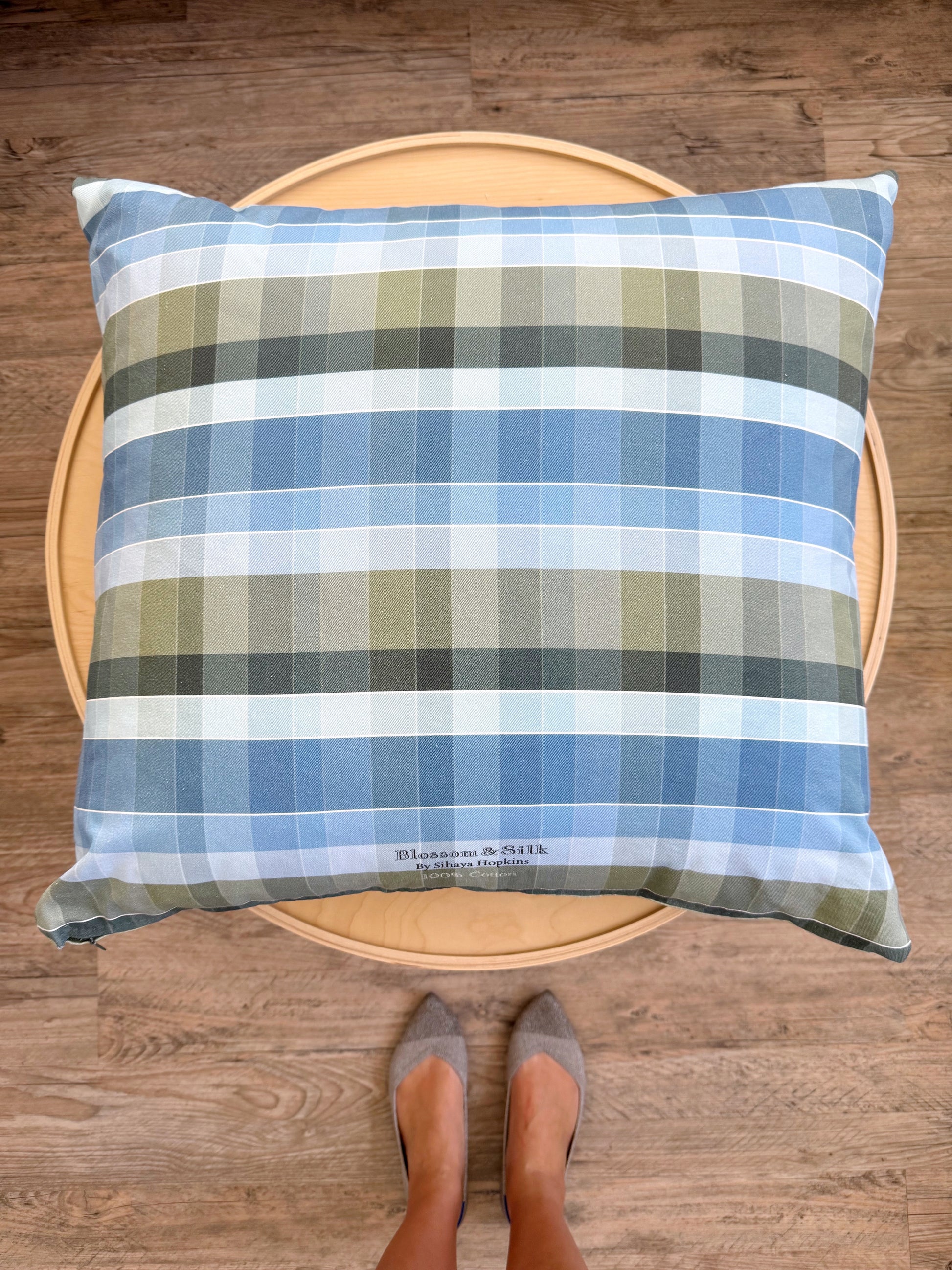 My Summer Sun drawing printed on Organic Cotton Drill as a 26” throw pillow. This drawing celebrates the green we get during a good summer monsoon and the big sky, clouds and sun that are so classic here. This has a plaid back with all the colors of the drawing, a hidden zipper along the bottom and a 26” feather pillow insert with a cotton case.