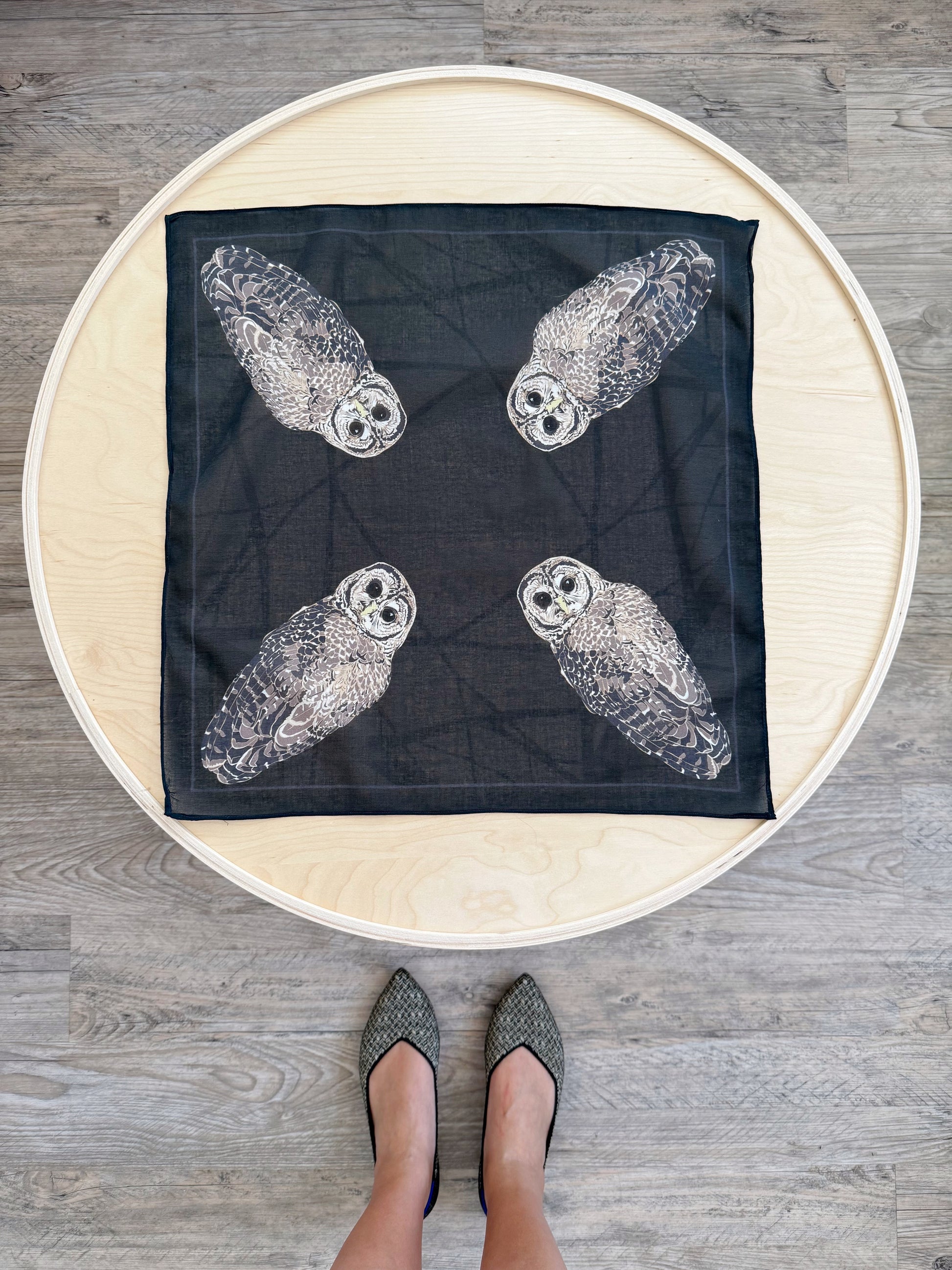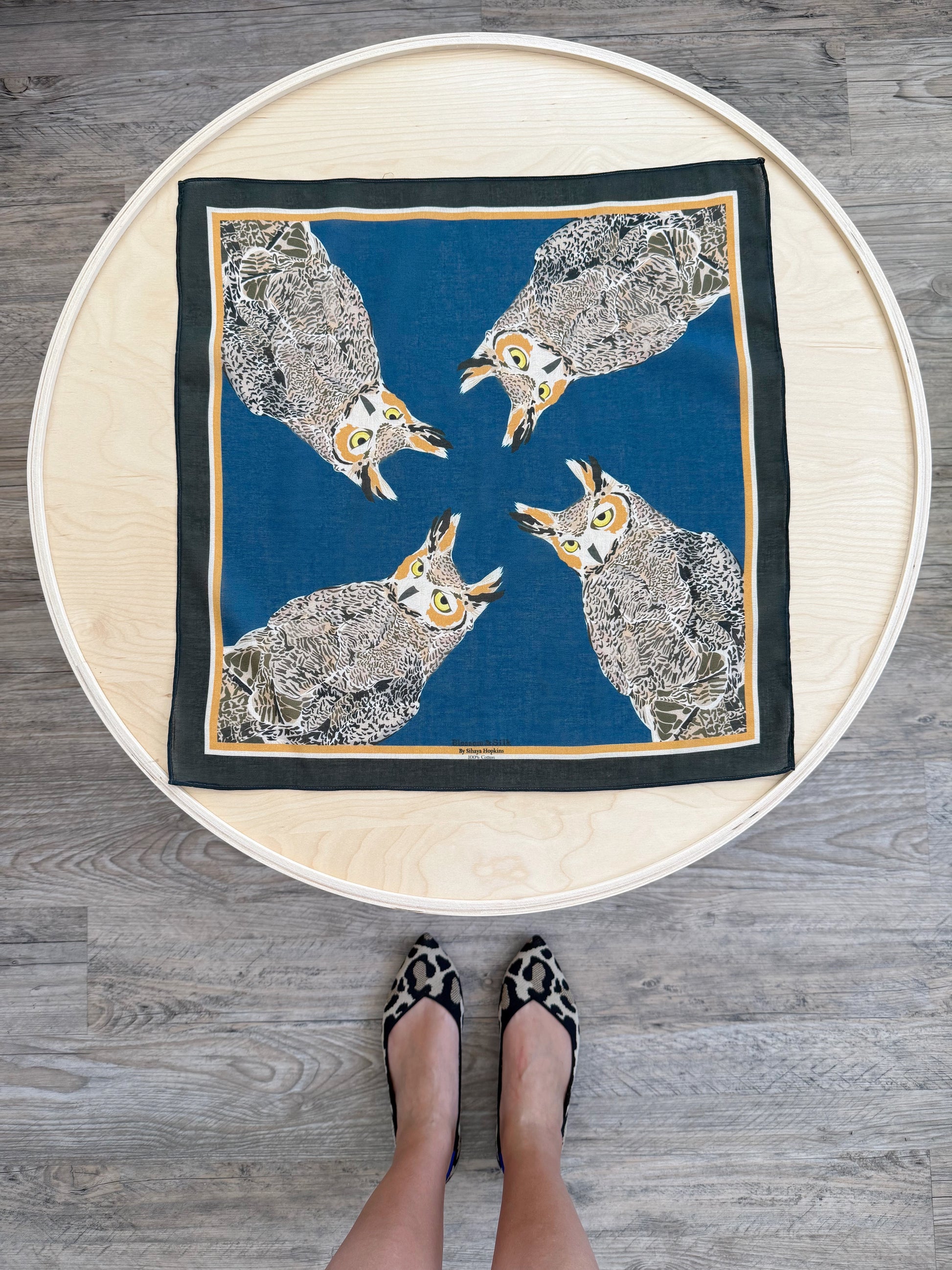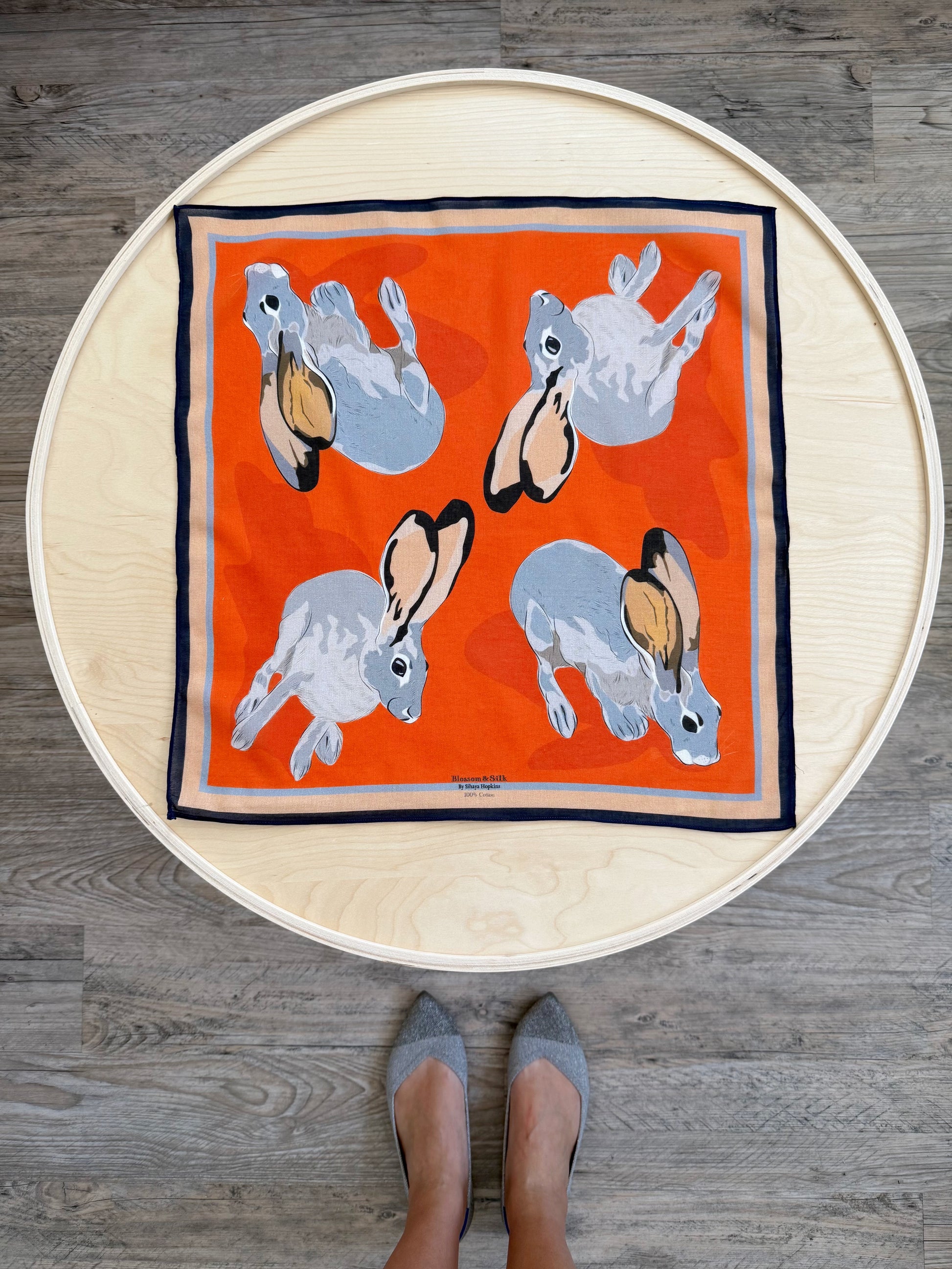 Small light weight cotton bandanas available in a selection from my New Mexico wildlife, landscapes and sky designs. Done in a soft, slightly sheer Mulayam Cotton with 1/8” machine stitched rolled hems, approximately 19” square. Fabric printed in the UK, drawings and stitching done by myself.