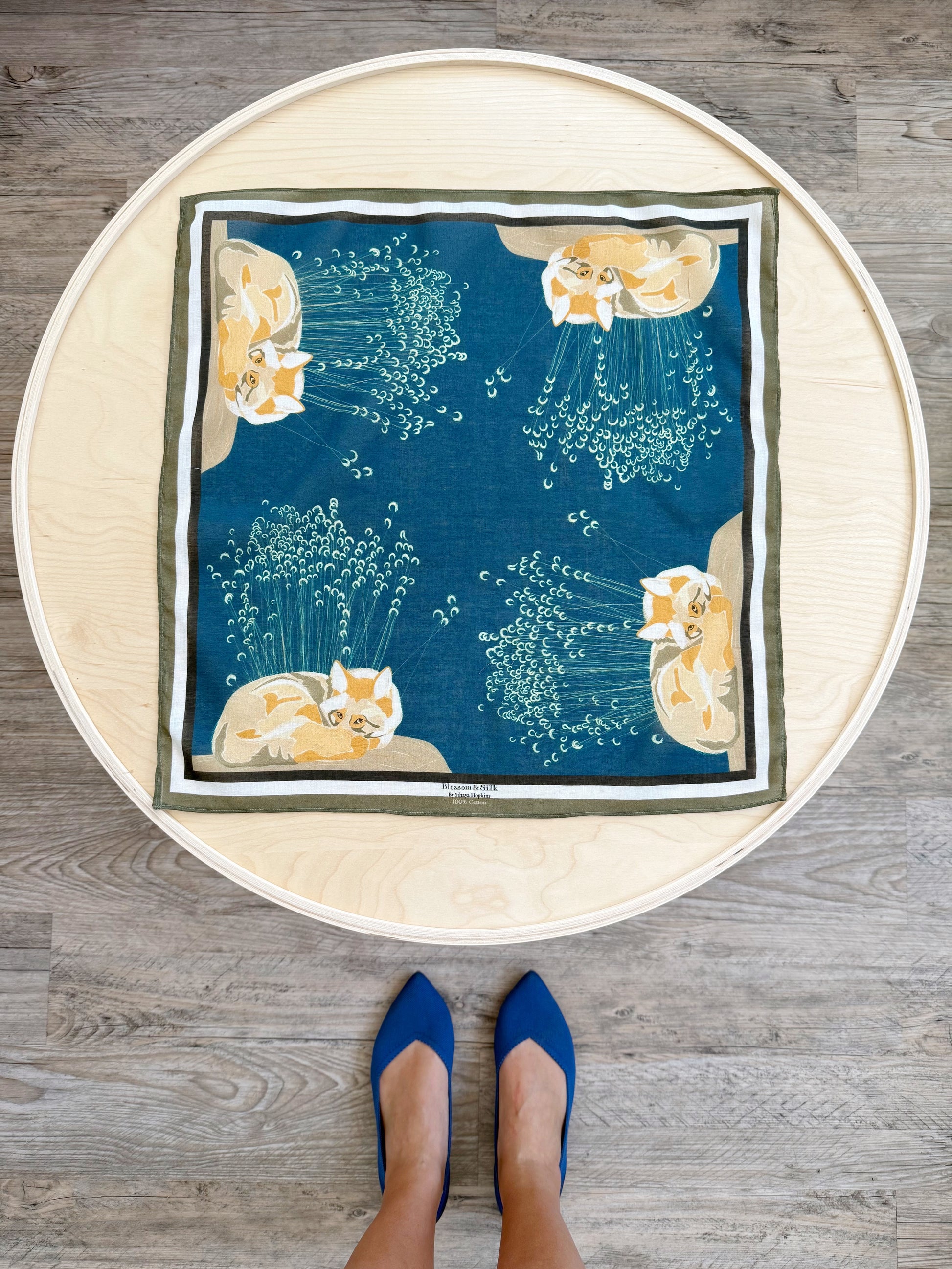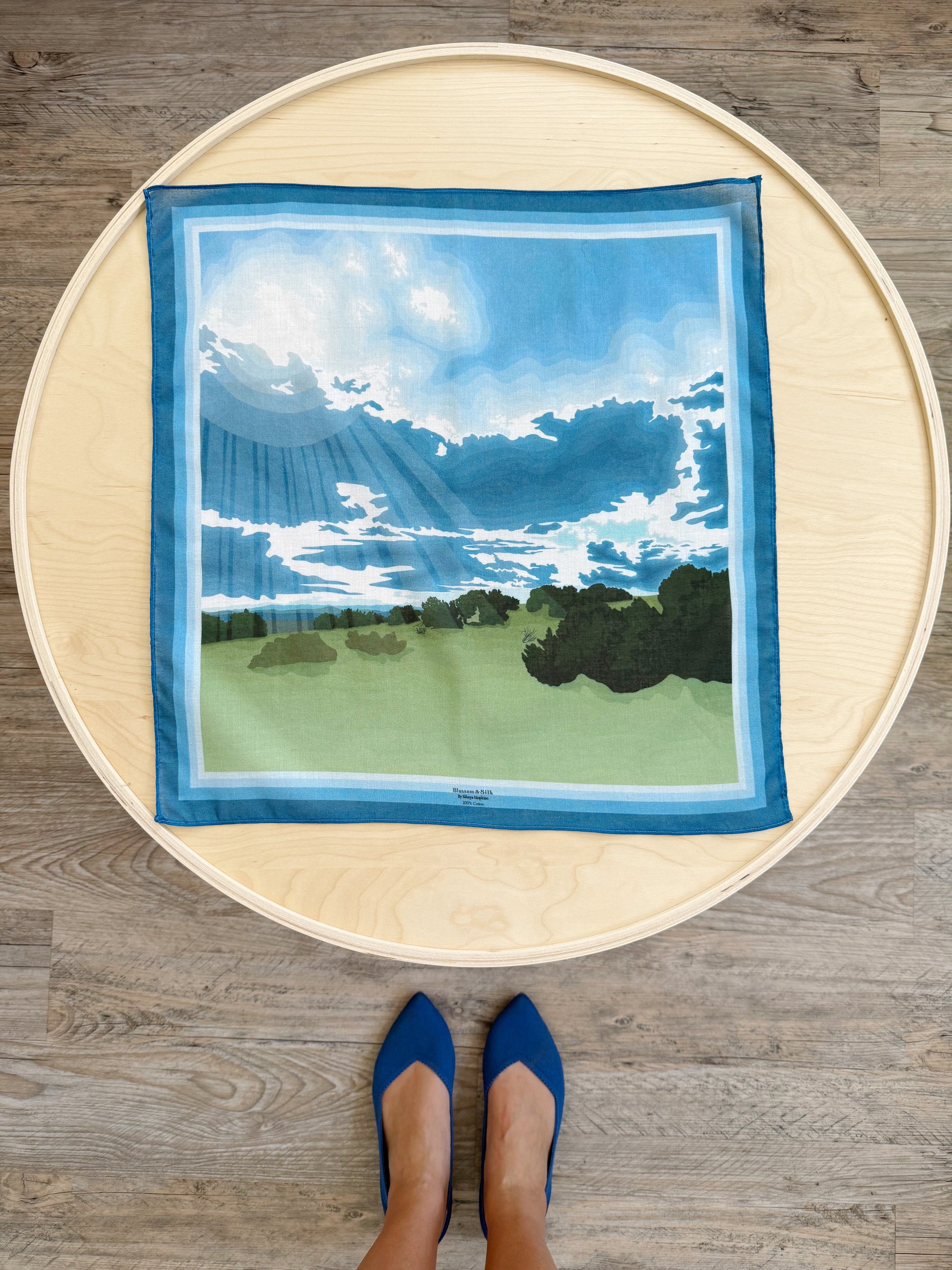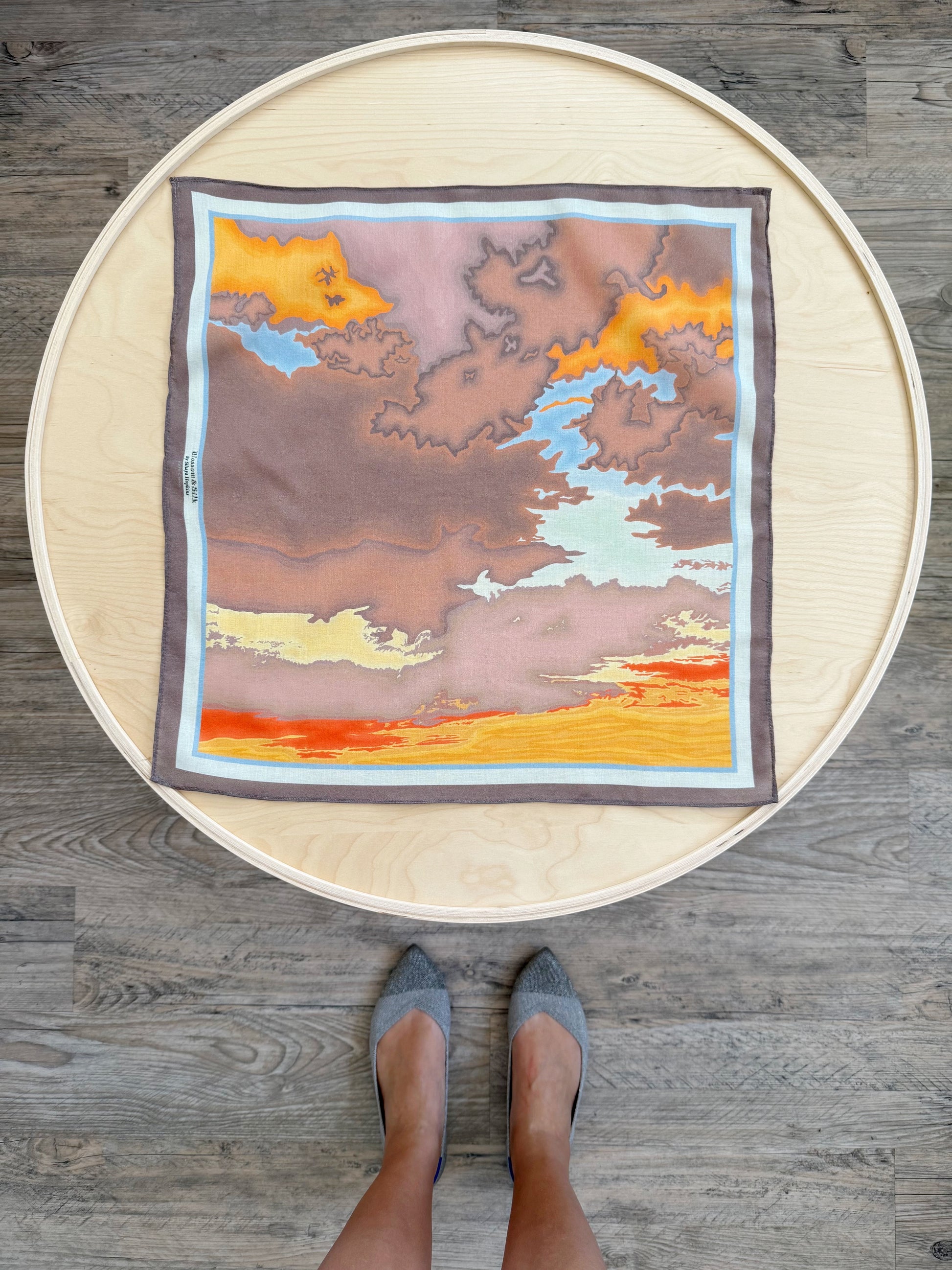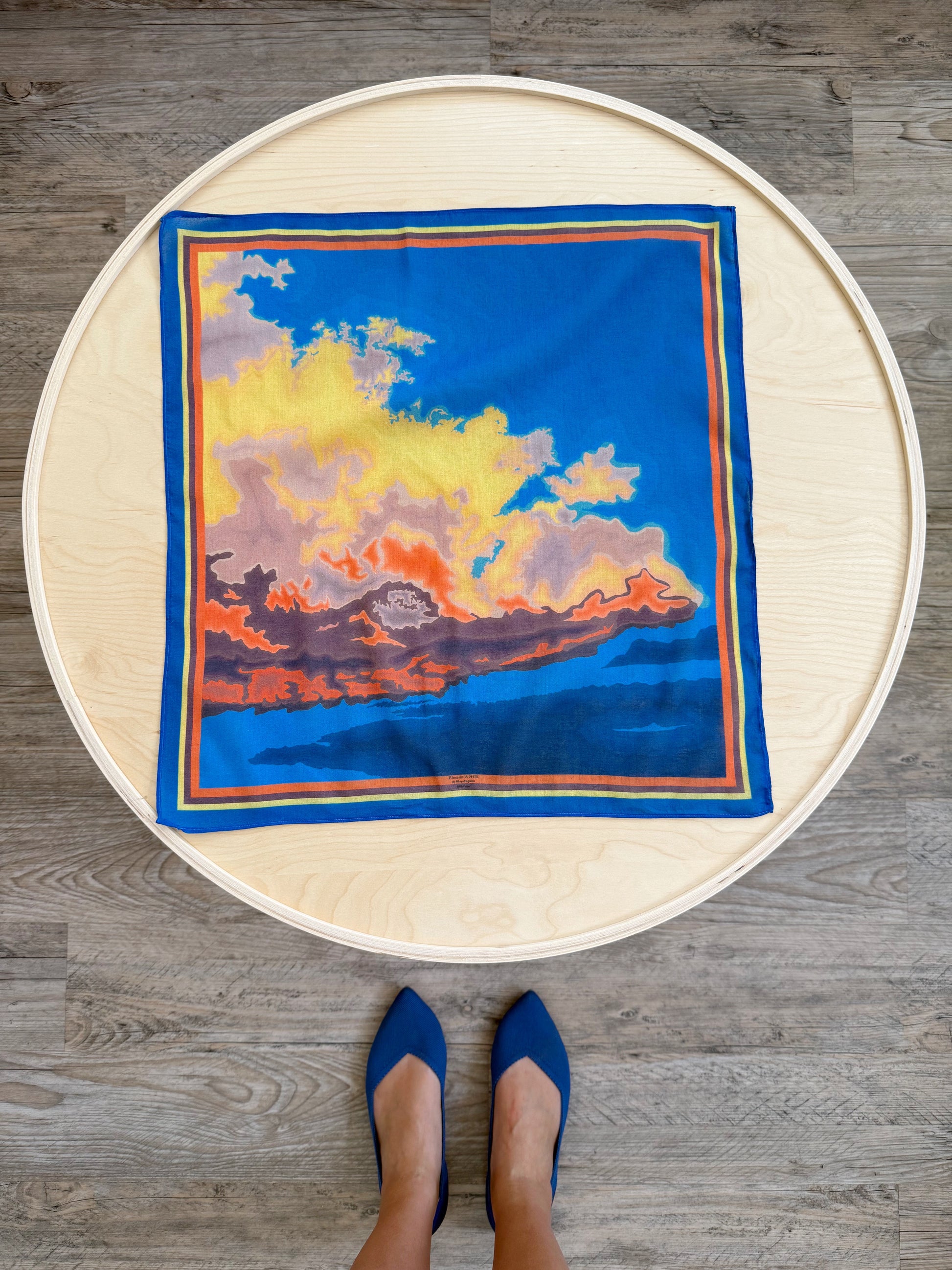 Small light weight cotton bandanas available in a selection from my New Mexico wildlife, landscapes and sky designs. Done in a soft, slightly sheer Mulayam Cotton with 1/8” machine stitched rolled hems, approximately 19” square. Fabric printed in the UK, drawings and stitching done by myself.